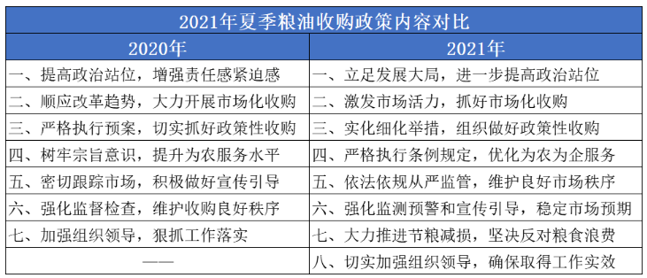5月6日國家糧食和物資儲備局下發(fā)《關(guān)于切實(shí)做好2021年夏季糧油收購工作的通知》,當前我國糧食市場(chǎng)形勢錯綜復雜,夏糧收購作為全年收購的首戰,組織做好夏糧收購工作至關(guān)重要。與2020年相比,今年取消了糧食收購資格許可相關(guān)規定,《通知》指出嚴禁變相審批,不得“明放暗不放”。此外針對市場(chǎng)化收購和政策性收購兩方面,依據中央經(jīng)濟工作會(huì )議、中央農村工作會(huì )議和中央一號文件,國家糧食和物資儲備局作出更為細化的部署安排?!锻ㄖ愤€增加了節糧減損、糧食浪費方面的內容。