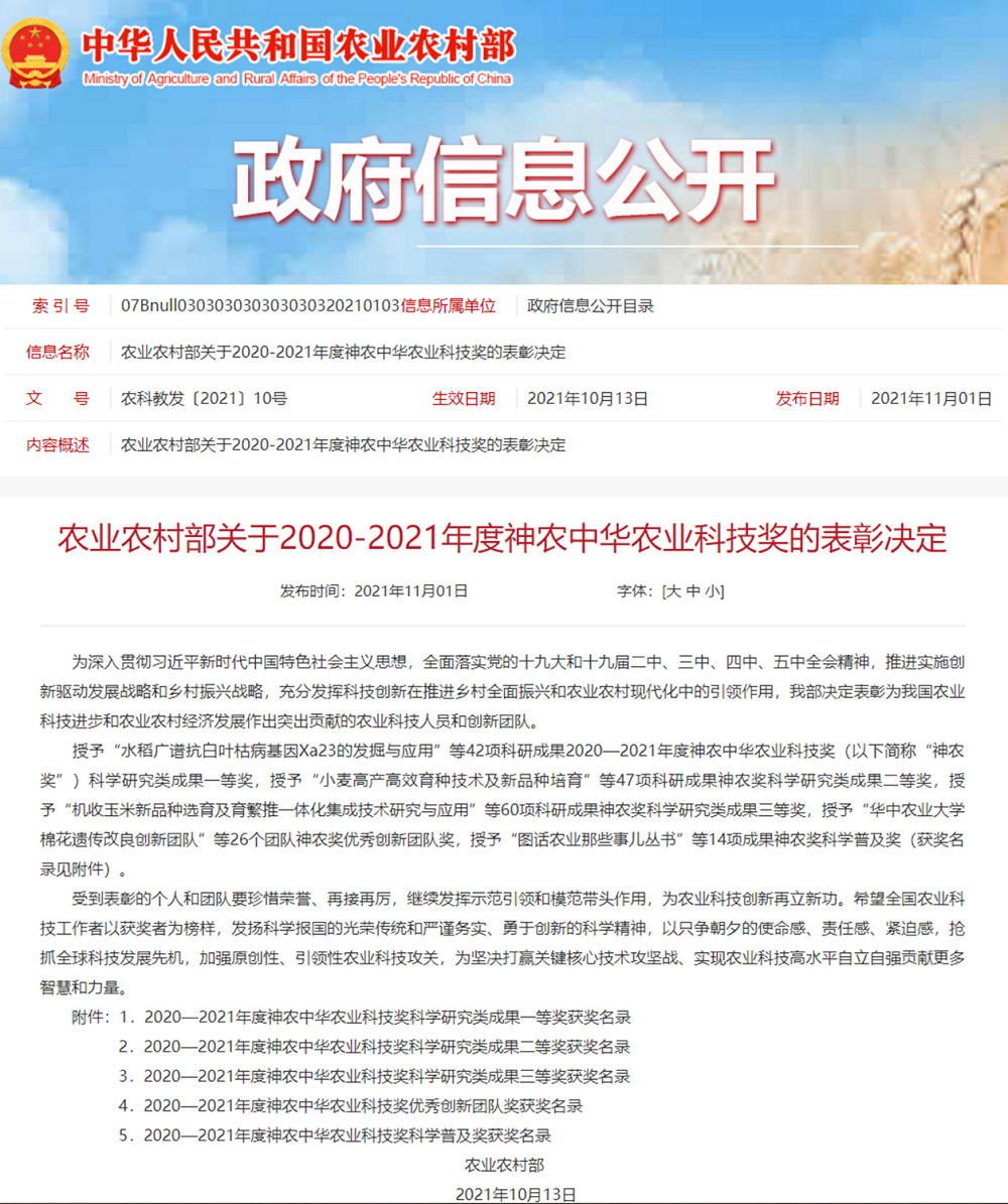 11月1日,農業(yè)農村部官網(wǎng)發(fā)布了《關(guān)于2020-2021年度神農中華農業(yè)科技獎的表彰決定》(農科教發(fā)〔2021〕10號),對在2020-2021年度為我國農業(yè)科技進(jìn)步和農業(yè)農村經(jīng)濟發(fā)展作出突出貢獻的農業(yè)科技人員和創(chuàng )新團隊進(jìn)行表彰。由江蘇省農墾農業(yè)發(fā)展股份有限公司主持,聯(lián)合江蘇省農業(yè)技術(shù)推廣總站、揚州大學(xué)共同完成的“稻麥兩熟畝產(chǎn)1200公斤綠色高效關(guān)鍵技術(shù)創(chuàng )新與應用”項目獲得科學(xué)研究類(lèi)成果三等獎。