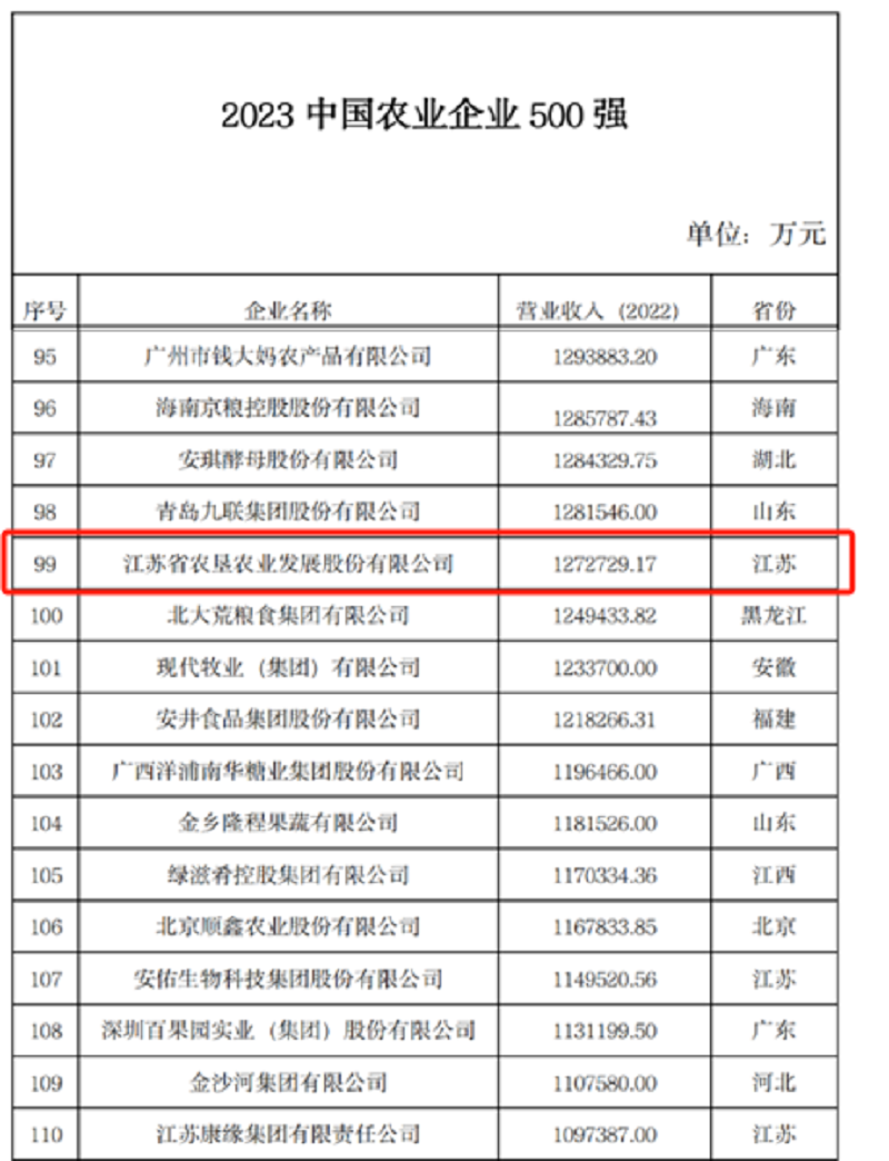 近日,農民日報社發(fā)布了2023中國農業(yè)企業(yè)500強名單,蘇墾農發(fā)再次成功入選,位列第99位,較去年提升22位;此次活動(dòng)還評選了2023中國農業(yè)企業(yè)行業(yè)20強名單,蘇墾農發(fā)再次入選農業(yè)社會(huì )化服務(wù)行業(yè)20強,位列第5位,較去年上升1位。再度入選中國農業(yè)企業(yè)500強、中國農業(yè)企業(yè)行業(yè)20強,標志著(zhù)蘇墾農發(fā)行業(yè)地位得到進(jìn)一步認可和鞏固,競爭優(yōu)勢得到進(jìn)一步凸顯和提升。