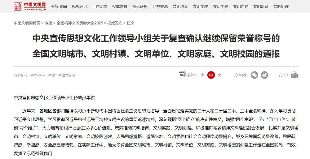 •        5月23日,中央宣傳思想文化工作領(lǐng)導小組公布《關(guān)于認定命名第七屆全國文明城市、文明村鎮、文明單位和第三屆全國文明家庭、文明校園的決定》和《關(guān)于復查確認繼續保留榮譽(yù)稱(chēng)號的全國文明城市、文明村鎮、文明單位、文明家庭、文明校園的通報》。蘇墾農發(fā)順利通過(guò)復查評估,繼續保留“全國文明單位”稱(chēng)號,這是繼2020年首創(chuàng )首成第六屆“全國文明單位”后又一次獲此殊榮。